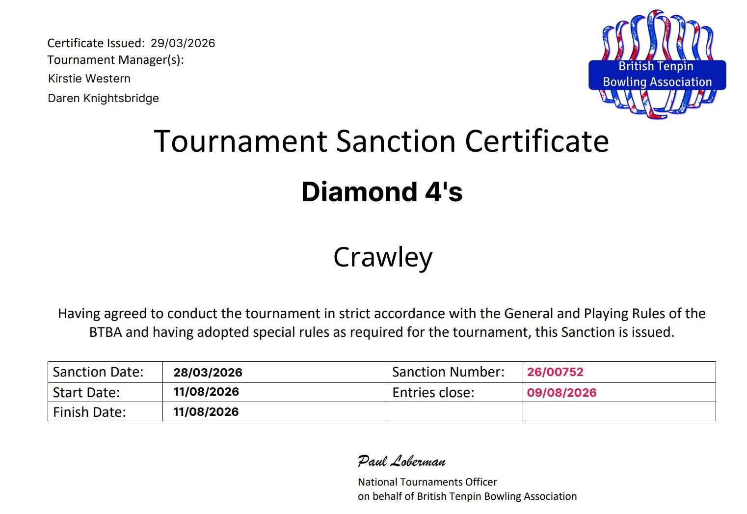1. This tournament will be sanctioned by the BTBA (Sanction No. 26/00752) and conforms to the general playing and tournament rules of the BTBA (available to view on the BTBA website) together with the following additions.