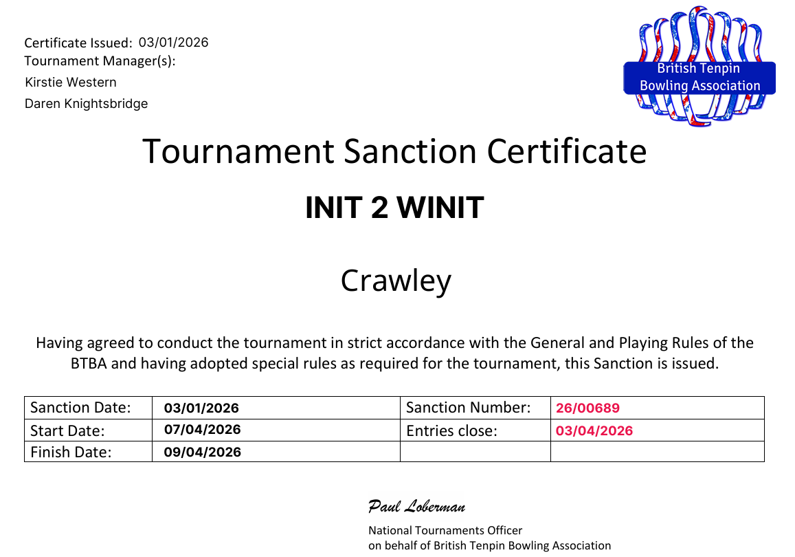 1. This tournament will be sanctioned by the BTBA (Sanction No. 26/00689) and conforms to the general playing and tournament rules of the BTBA (available to view on the BTBA website) together with the following additions.